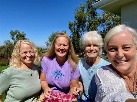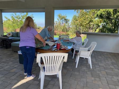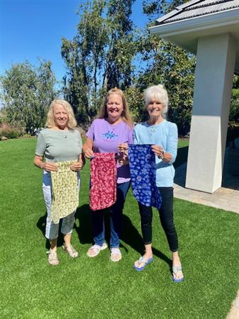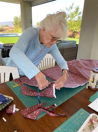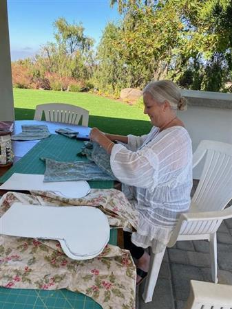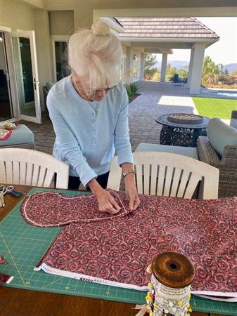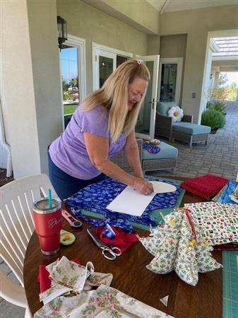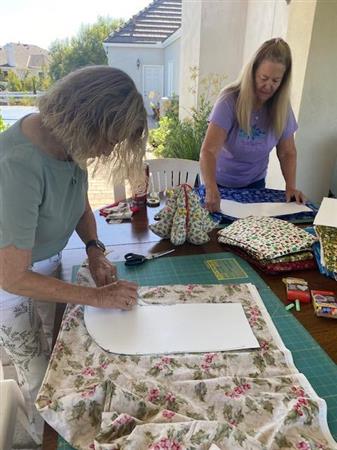 Rotarians gathered at the home of Cheryl Minshew to cut out panels for making Christmas stockings to be distributed to kids in need.